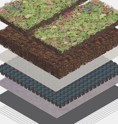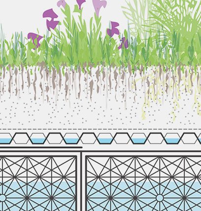 Our waterproof membrane solutions provide durability, flexibility, compatibility with leak detection & prevention systems; as well ease of installation. What differentiates us from all other complete green roofing solutions is that we provide total system warranties that allow for ponding water. This enables our roofs to become stormwater capturing solutions.